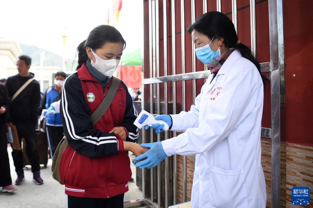 碌曲縣藏族中學(xué)學(xué)生進入校園時測量體溫(8月30日攝)。新華社記者 杜哲宇 攝