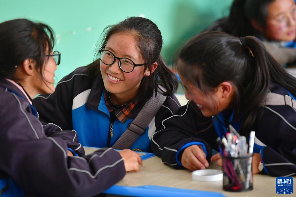 碌曲縣藏族中學(xué)的高三學(xué)生在教室里交流(8月30日攝)。新華社記者 杜哲宇 攝