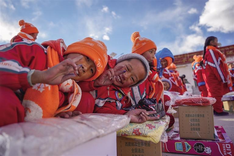 “扎西旺堆,過來領(lǐng)你的足球,還有去老師那邊拿盲盒和毛衣。”當(dāng)木江鄉(xiāng)初小校長(zhǎng)旦增頓珠將孩子們一個(gè)個(gè)叫過來。在一旁的王順利、申國(guó)強(qiáng)負(fù)責(zé)給孩子們發(fā)放心愿禮物,西藏商報(bào)記者、工作人員給孩子們遞上一個(gè)個(gè)“盲盒”。