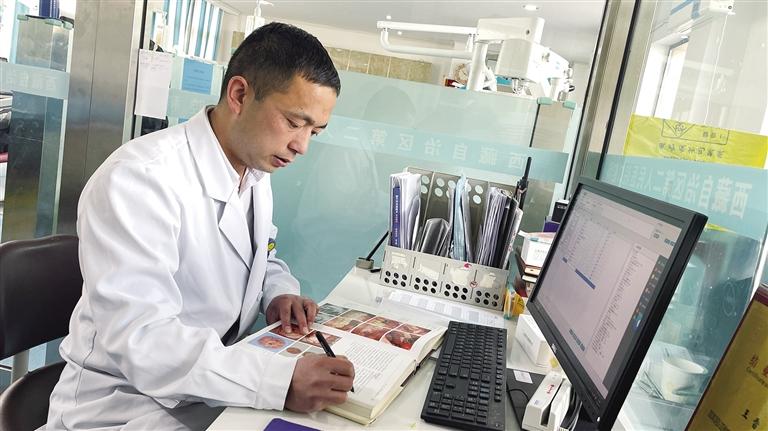 王雷在學(xué)習(xí)口腔專業(yè)知識(shí)。 文/圖 記者 婁夢(mèng)琳 次吉