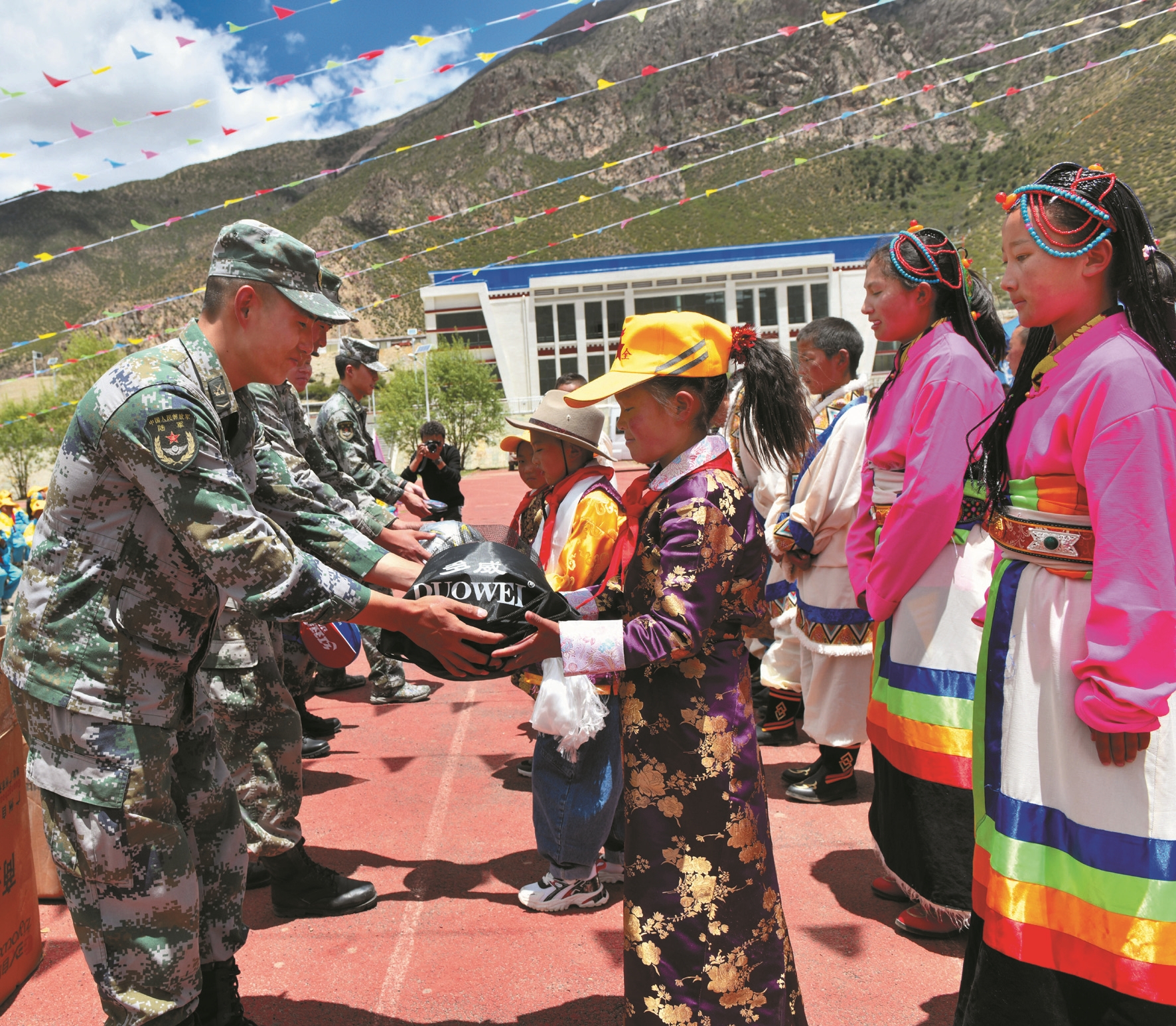 圖為活動(dòng)現(xiàn)場(chǎng),西藏軍區(qū)某部戰(zhàn)士向阿朗鄉(xiāng)中心小學(xué)學(xué)生捐贈(zèng)愛心物品。(市委宣傳部駐拉康村工作隊(duì)供圖)