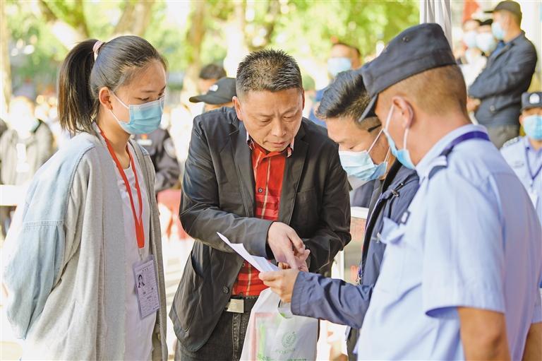 圖為拉薩中學考點門前,民警正在為考生家長提供幫助。記者 唐斌 攝