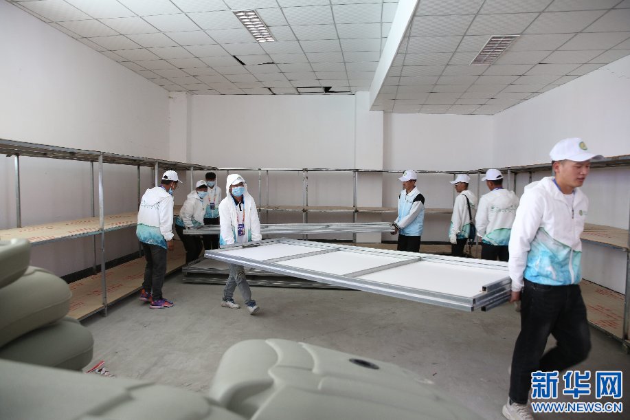 志愿者正在布置運(yùn)動(dòng)會(huì)場(chǎng)地。(劉勇 攝)