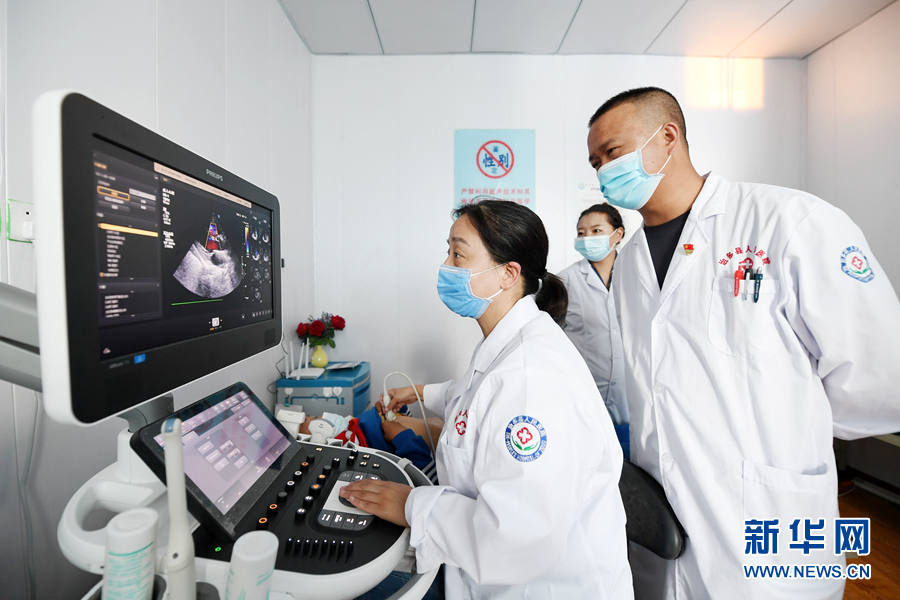8月11日,在治多縣人民醫(yī)院,北京同仁醫(yī)院醫(yī)療專家楊青苗(左一)篩查先心病患兒。新華社記者 范培珅 )