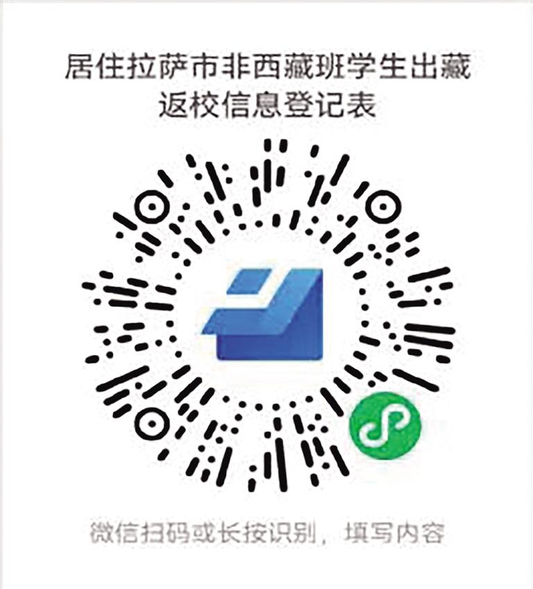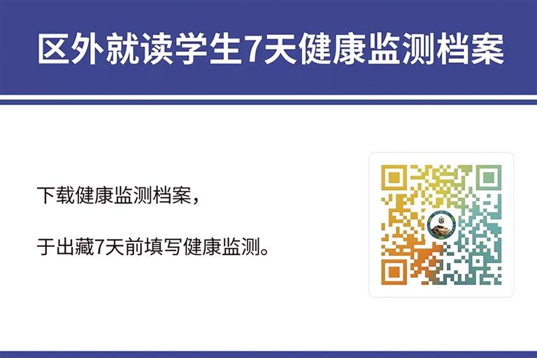 根據(jù)拉薩市委、市政府和自治區(qū)教育廳部署安排,為準(zhǔn)確掌握學(xué)生出藏行程規(guī)劃,為民航、鐵路等交通部門調(diào)配運(yùn)力提供參考依據(jù),拉薩市教育局需精準(zhǔn)掌握居住在拉薩市的區(qū)外就讀西藏籍大學(xué)生、區(qū)外非西藏班就讀西藏干部職工子女、區(qū)外就讀進(jìn)城務(wù)工人員子女、旅居區(qū)內(nèi)的區(qū)外學(xué)生出藏相關(guān)信息,請(qǐng)廣大家長(zhǎng)、學(xué)生積極配合,掃描以下二維碼,填報(bào)出行信息;下載健康監(jiān)測(cè)檔案,于出藏7天前填寫健康監(jiān)測(cè)。