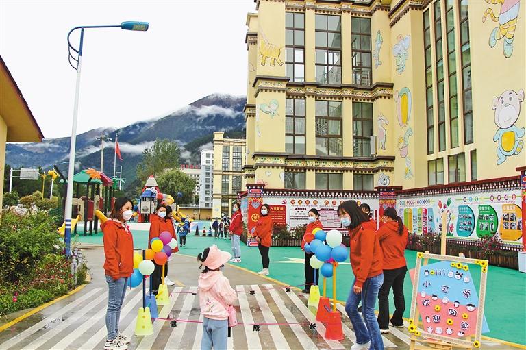 圖為林芝市第三幼兒園教師歡迎小朋友們?nèi)雸@。 劉向宙 記者 王珊 攝
