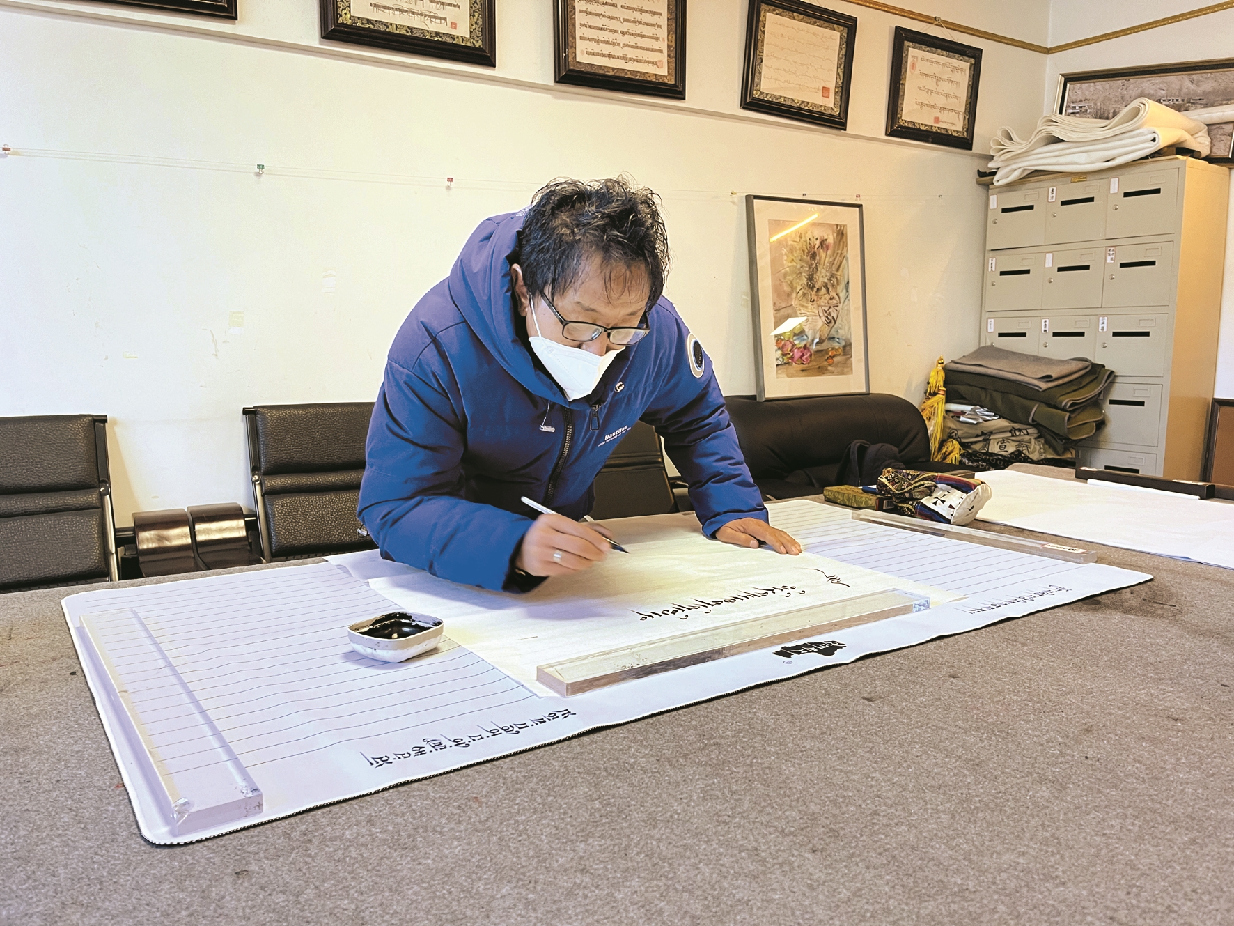 圖為市書法家協(xié)會副主席南杰旺扎正在書寫黨的二十大報告金句。 拉薩融媒記者 莫瑞英攝