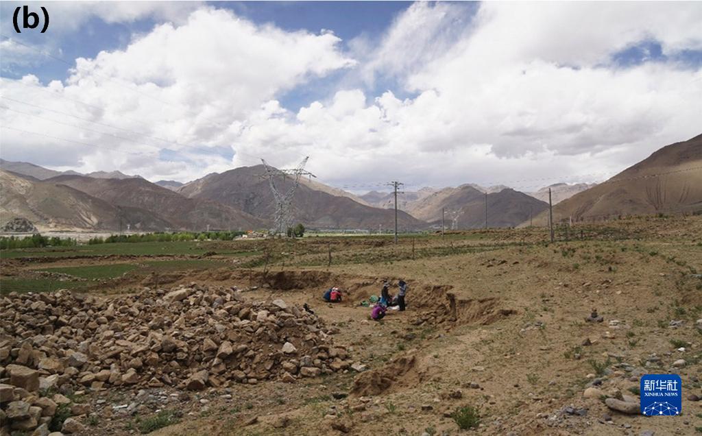 圖(b)為科考隊(duì)員發(fā)現(xiàn)共塘遺址后隨即進(jìn)行地層剖面清理和樣品采集。(資料圖片由第二次青藏科考隊(duì)“人類活動歷史及其影響”分隊(duì)提供)