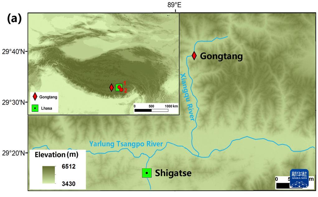 圖(a)為雅魯藏布江中游部分地區(qū)遺址背景資料圖,曲貢(1)、邦嘎(2)和共塘遺址位置(紅色菱形所示)。(資料圖片由第二次青藏科考隊(duì)“人類活動歷史及其影響”分隊(duì)提供)
