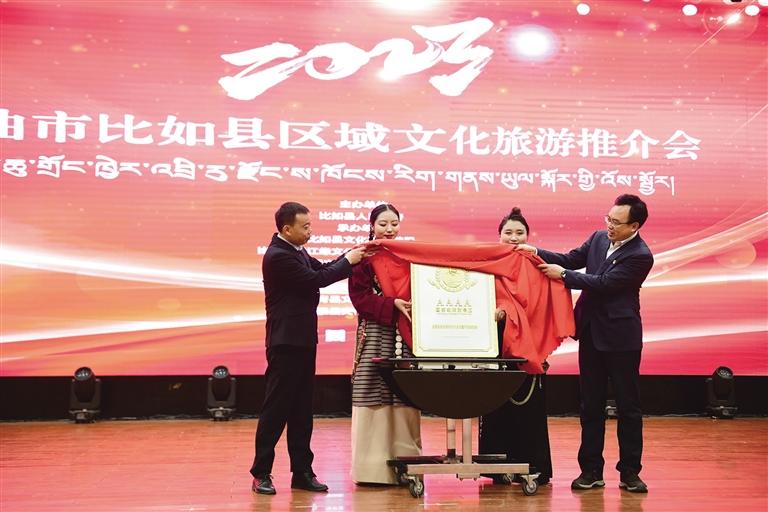 隨后,比如縣、索縣、巴青縣、嘉黎縣代表依次通過文旅資源推介向大家展現(xiàn)了不同縣區(qū)別樣的自然風(fēng)光與人文風(fēng)采。同時(shí),現(xiàn)場(chǎng)還舉辦了比如唐蕃古道文化旅游景區(qū)國(guó)家AAAA級(jí)旅游景區(qū)揭牌儀式。