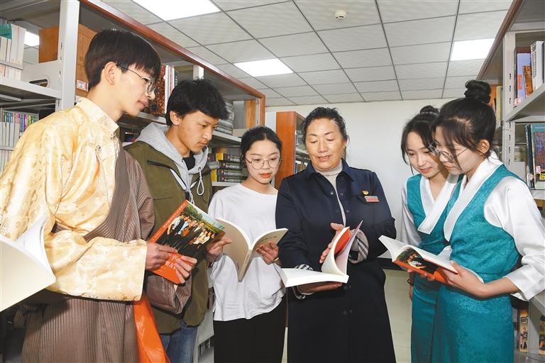 圖為在西藏大學圖書館,央宗老師和學生分享《習近平與大學生朋友們》一書。記者 李洲 攝