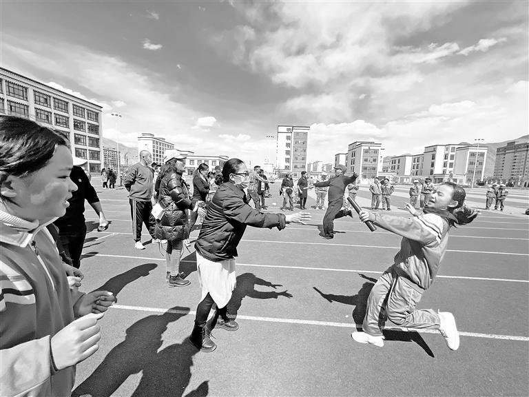 圖為學(xué)生及家長參加接力比賽。記者央金 攝