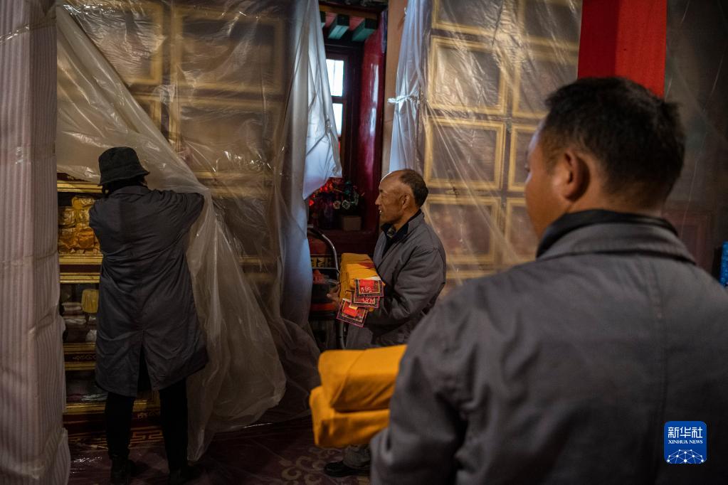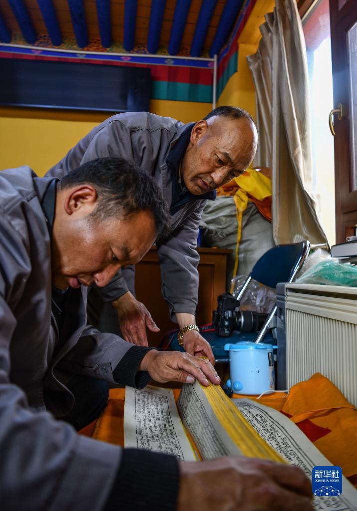 久米次成(左)與同事搬運準(zhǔn)備進行普查登記的古籍(4月19日攝)。新華社記者 晉美多吉 攝