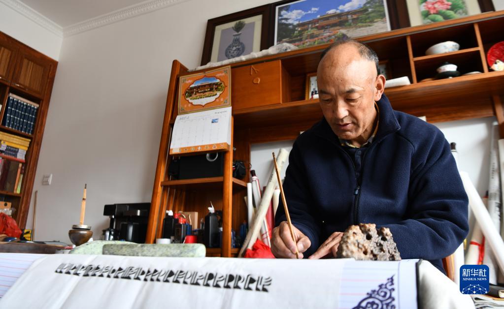 久米次成在家中撰寫梵文書法(4月19日攝)。新華社記者 晉美多吉 攝