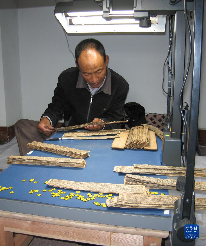 久米次成在西藏自治區(qū)博物館整理影印貝葉經(jīng)(2008年6月26日攝)。新華社發(fā)