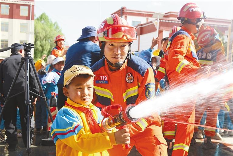 日喀則市小學學生體驗滅火救援器材。