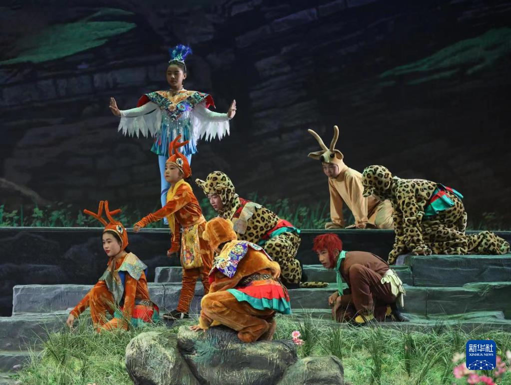 藏戲小演員在舞臺(tái)上表演少兒舞臺(tái)劇藏戲《頓月頓珠》。
