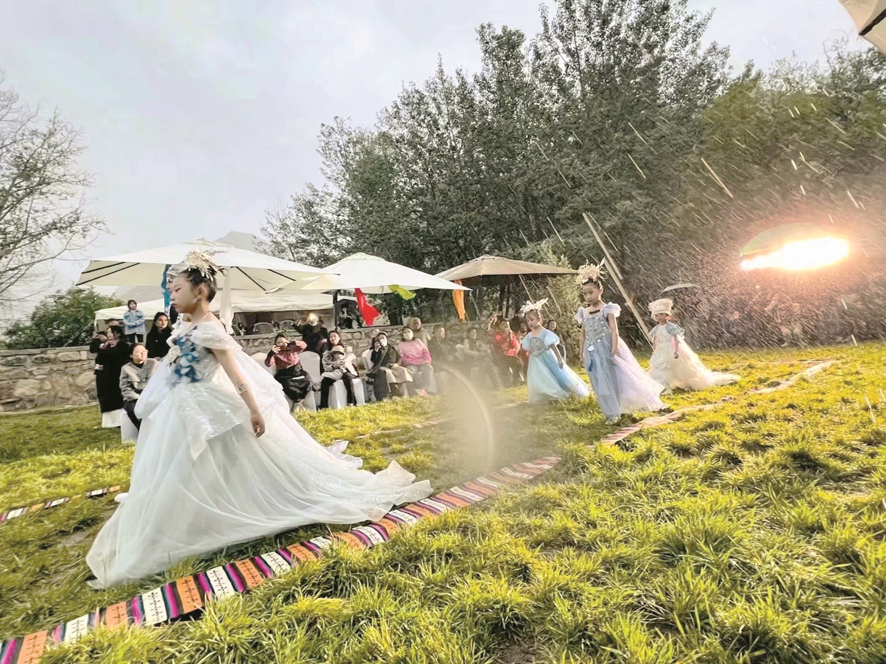 模特秀上,盡管天公不作美下起了雨,但小模特們跟隨著動感十足的韻律在雨中自信走秀,燃爆全場,極具個性色彩的藏族與苗族服裝展現(xiàn)了傳統(tǒng)文化與時尚設(shè)計的交相輝映,凸顯出“傳統(tǒng)與新潮”的極度融合,體現(xiàn)了“各美其美,美美與共”的文化關(guān)聯(lián)。