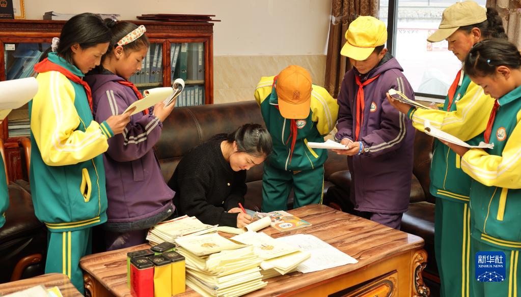 潘紅培在給孩子們批改作業(yè)。新華社記者 劉文博 攝