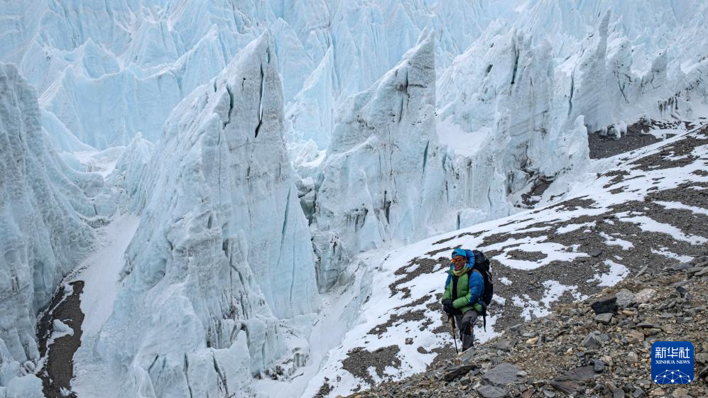 圖為高山向?qū)Т稳首哌^(guò)珠峰東絨布冰川。新華社記者 晉美多吉 攝