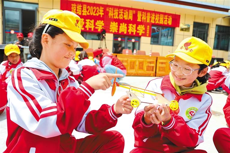 圖為瓊結(jié)縣拉玉鄉(xiāng)小學(xué)學(xué)生在對拼裝完成的橡皮筋動力車進(jìn)行實(shí)驗(yàn)。(資料圖片)記者 白瑪澤旺 通訊員 倫珠澤仁 攝