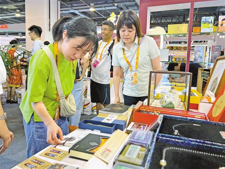 圖為觀眾在服貿會西藏展廳了解、挑選文創(chuàng)產品。記者 張姝 攝