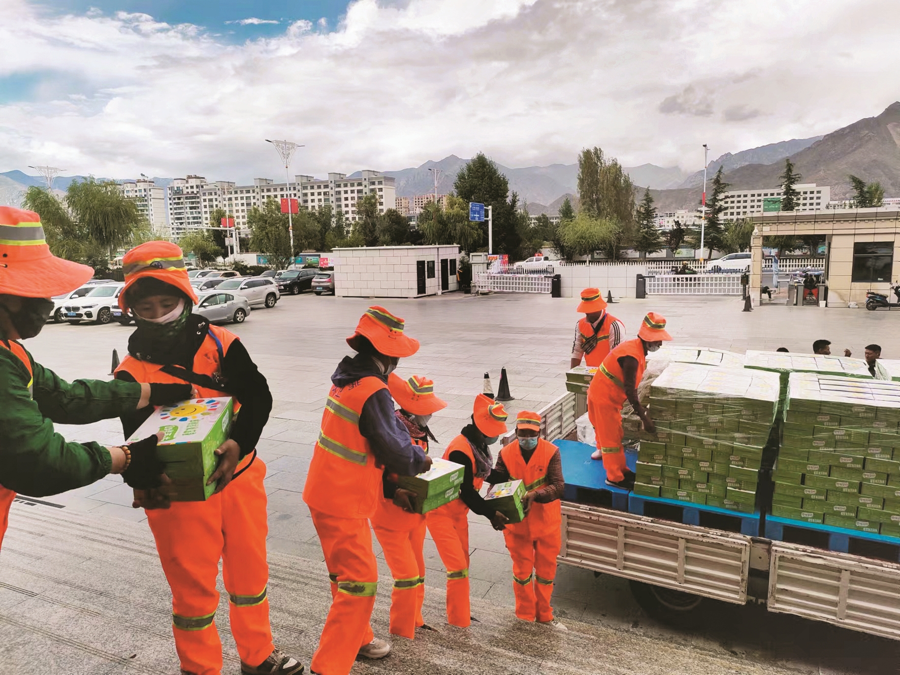 圖為西藏凈土乳業(yè)有限公司將自產(chǎn)牛奶送到環(huán)衛(wèi)工人手中。 拉薩融媒記者 李從芳攝