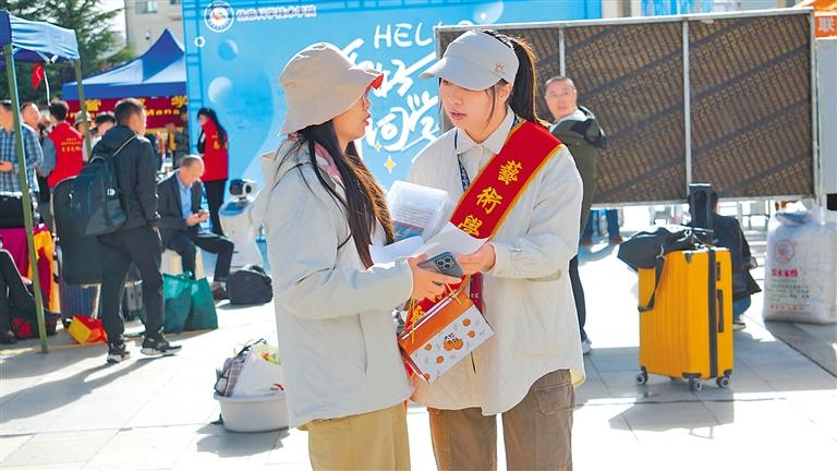 圖為西藏大學(xué)志愿者(右)與新生交談。記者 鄭璐 攝