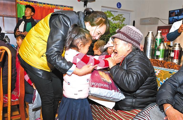 圖為拉薩市實驗幼兒園的小朋友為老人們送上保暖衣物。記者 旦增蘭澤 攝