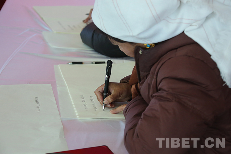圖為書法比賽獲獎代表現(xiàn)場進行了漢藏書法書寫展示。攝影:德吉卓瑪