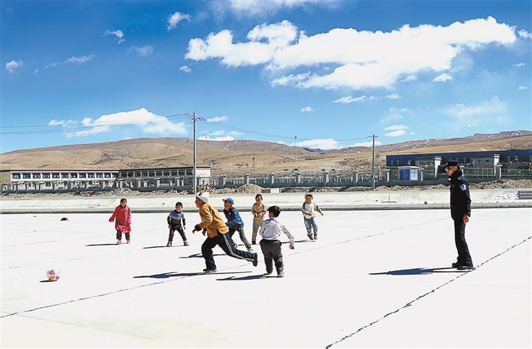 在結束執(zhí)勤,返回宿舍途中,里孜出入境邊防檢查站民警楊會強、盧帆忽聞一陣嬉笑。循聲看去,口岸邊貿(mào)市場停車場內(nèi),一群充滿活力的小朋友,正圍著一個破舊足球追趕。
