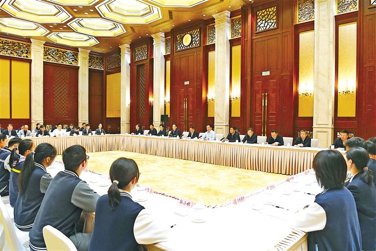 5月10日至11日,西藏自治區(qū)黨政代表團(tuán)赴上海學(xué)習(xí)考察。這是王君正看望西藏班師生、西藏籍高校畢業(yè)生就業(yè)代表,聽(tīng)取他們?cè)谏虾W(xué)習(xí)、工作情況。 記者 李洲 攝