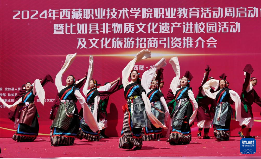 當(dāng)日,西藏職業(yè)技術(shù)學(xué)院職業(yè)教育活動(dòng)周在拉薩啟動(dòng),那曲市比如縣民族藝術(shù)團(tuán)非物質(zhì)文化遺產(chǎn)表演暨“鄉(xiāng)村振興 那曲奮進(jìn)”旅游推介走進(jìn)校園,激發(fā)人們對(duì)傳統(tǒng)文化和特色旅游的興趣。