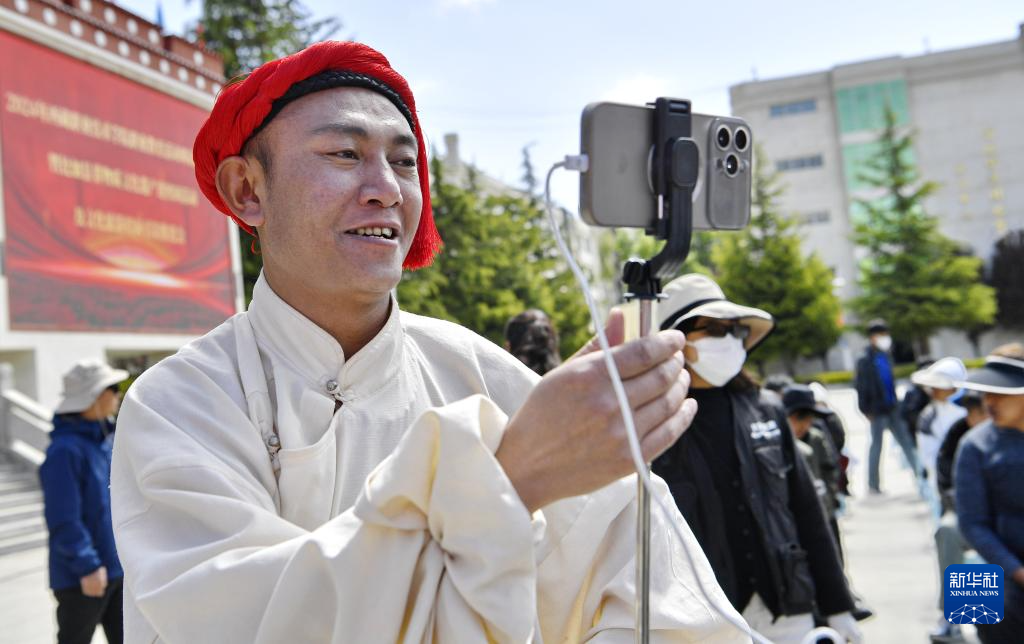 5月12日,在西藏職業(yè)技術(shù)學(xué)院職業(yè)教育活動(dòng)周啟動(dòng)儀式暨比如縣非物質(zhì)文化遺產(chǎn)進(jìn)校園活動(dòng)上,來自比如縣的一名旅游推介者在做現(xiàn)場直播。新華社記者 張汝鋒 攝