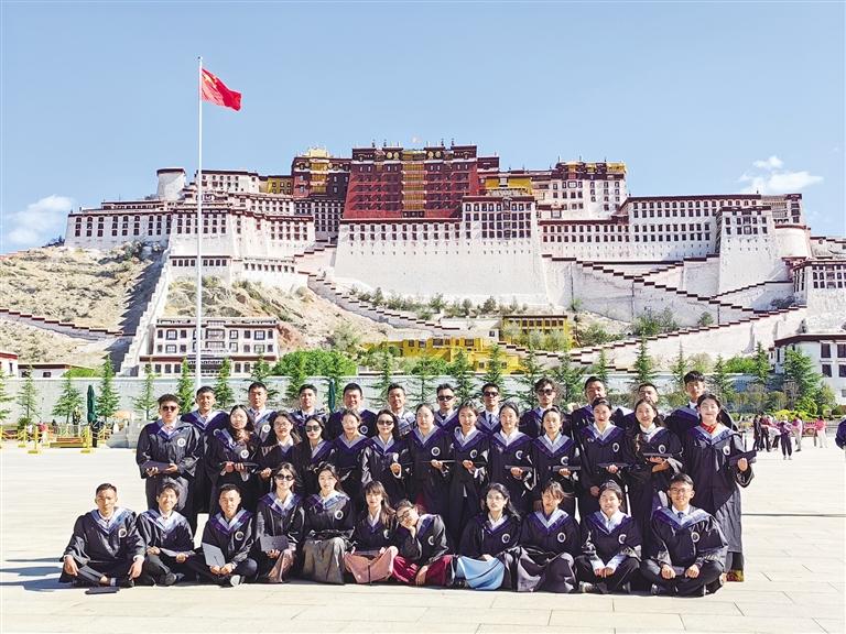 拍攝畢業(yè)照則是高校每一屆畢業(yè)生的“狂歡”。盛夏里,高校畢業(yè)生們身穿學(xué)士服或獨具特色的藏裝,相互獻(xiàn)哈達(dá),在布達(dá)拉宮廣場、在校園、在羅布林卡、在拉薩河邊留下青春最美的樣子,定格炙熱的青春歲月。