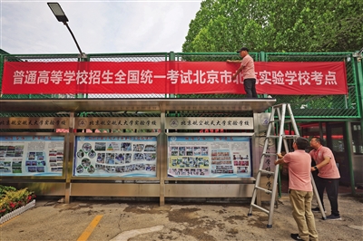 6月6日,記者在北京航空航天大學(xué)實(shí)驗(yàn)學(xué)校中學(xué)部(簡(jiǎn)稱“北航實(shí)驗(yàn)學(xué)?!保┛键c(diǎn)看到,學(xué)校西門(mén)處已懸掛起高考考點(diǎn)橫幅、考場(chǎng)布置已就位,校園內(nèi)放置了多個(gè)溫馨的提示語(yǔ)標(biāo)牌。據(jù)悉,該校是今年新增高考考點(diǎn)之一,承接來(lái)自9所學(xué)校277名考生的高考組考任務(wù)。此外,記者還探訪了北京高考人大附中經(jīng)開(kāi)學(xué)??键c(diǎn)
