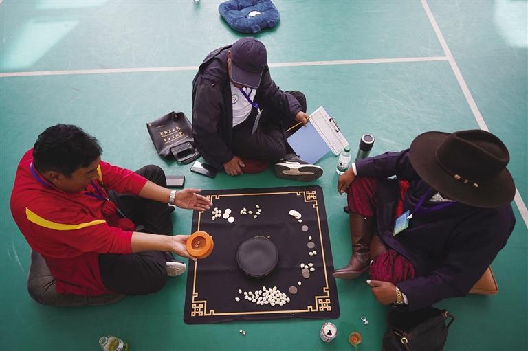 當(dāng)日,“吉韌”“秀茲”等項目一同開賽。 “吉韌”也叫藏式克郎球,是藏族的一種彈指運動。比賽在一張邊長約1米的正方形木桌球臺上進行,球臺四角有4個小洞,黑、白兩種扁圓形球子各9個,另有1個紅色球子放置在球臺中心,1個白色母球供雙方彈擊球子所用。