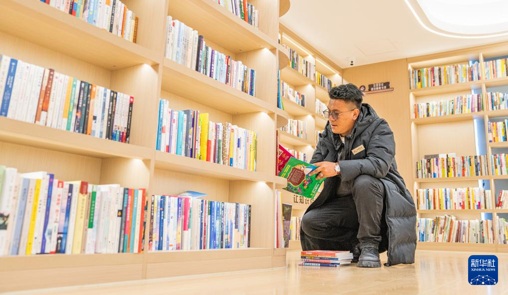 “溫暖嘉·色尼城市書房”管理員白瑪扎西正在整理書籍(6月17日攝)。新華社記者 丁增尼達(dá) 攝