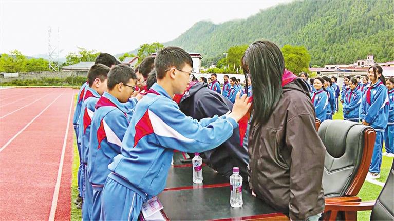 學(xué)生為老師系紅領(lǐng)巾。記者 胡文 通訊員 旦珍 攝
