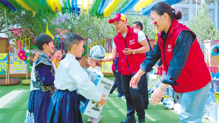圖為公司員工在給孩子們贈(zèng)送禮物。艾堅(jiān) 記者 盧文靜 攝