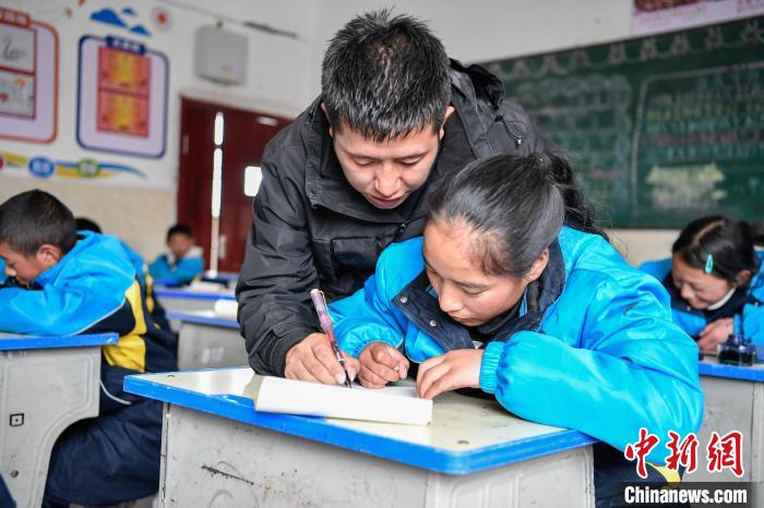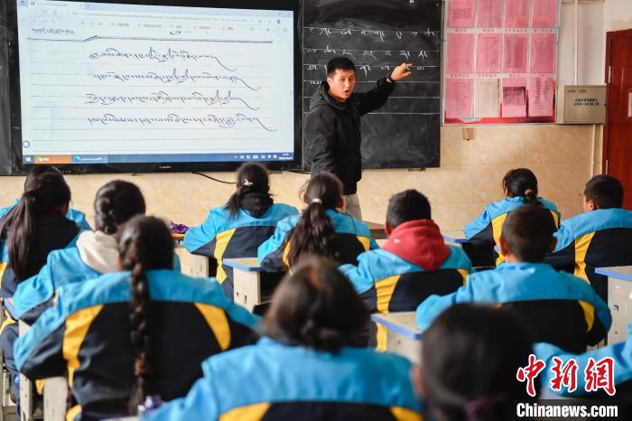 10月25日,在西藏自治區(qū)那曲市聶榮縣中學(xué),學(xué)生在老師的帶領(lǐng)下學(xué)習(xí)藏文書法。中新社記者 貢嘎來松 攝