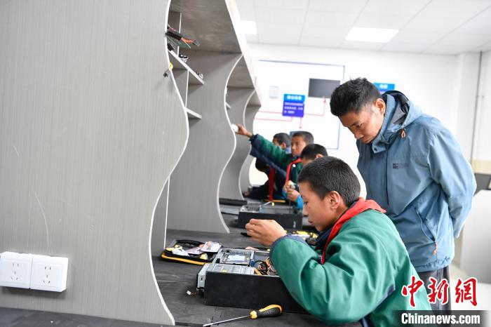 10月25日,在西藏自治區(qū)那曲市聶榮縣中學(xué),學(xué)生在老師的帶領(lǐng)下學(xué)習(xí)舊電腦拆裝。中新社記者 貢嘎來松 攝