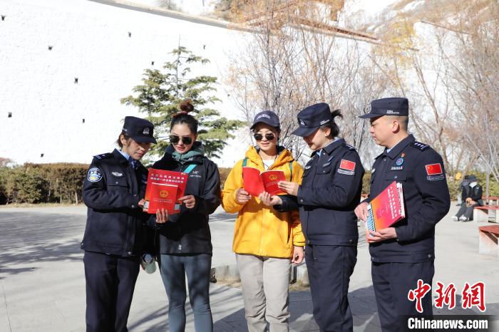 圖為西藏邊檢總站執(zhí)法調(diào)查支隊(duì)法制民警向游客普及憲法知識(shí)。徐錫萬(wàn) 攝