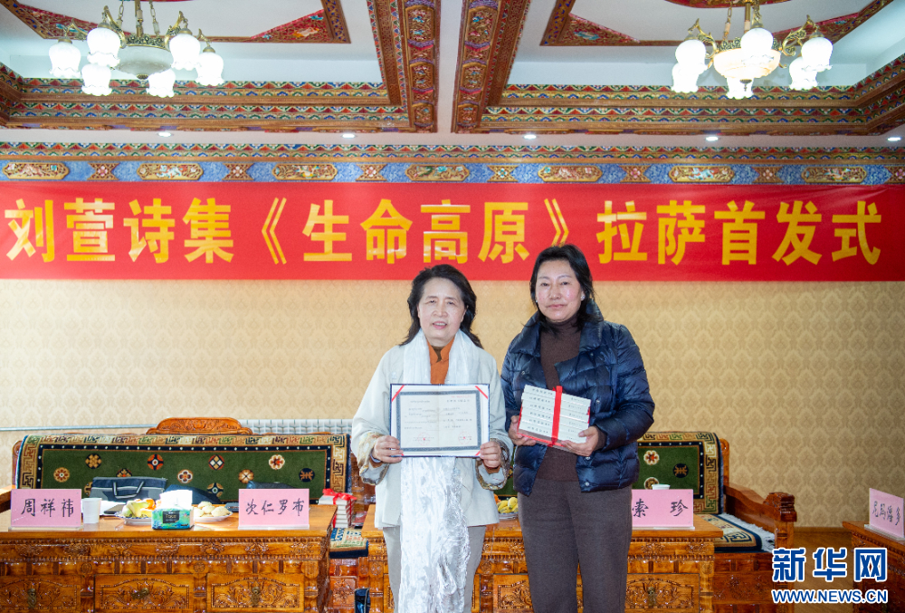 1月15日,在活動現(xiàn)場劉萱向西藏自治區(qū)作協(xié)、西藏自治區(qū)圖書館捐贈了《生命高原》詩集。新華網(wǎng) 旦增努布 攝