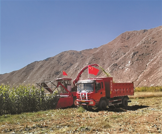 上午11時(shí),收割工作緊張有序進(jìn)行,多臺青貯收割機(jī)開足馬力在田地里奔忙。在齒輪的旋轉(zhuǎn)下,青貯玉米自動(dòng)收割、粉碎、裝進(jìn)運(yùn)輸車,空氣中混合著濃郁清新的草香味,到處是一派繁忙的收獲景象,這為全區(qū)牦牛越冬儲備下了充足的“口糧”。