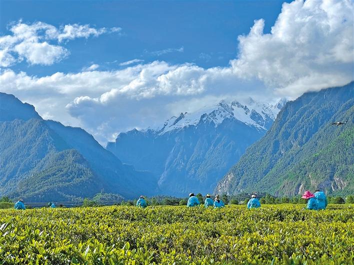 天朗氣清,茶韻悠悠。西藏林芝波密縣易貢茶場(chǎng)里,油菜花開得正艷;廣袤的湖畔牧場(chǎng)上,馬牛成群;茶農(nóng)們穿梭在茶林間,他們身挎茶簍,兩手并用,掐準(zhǔn)“一葉一茶”,快速放入簍里,舉手低頭間,茶簍逐漸被裝滿。