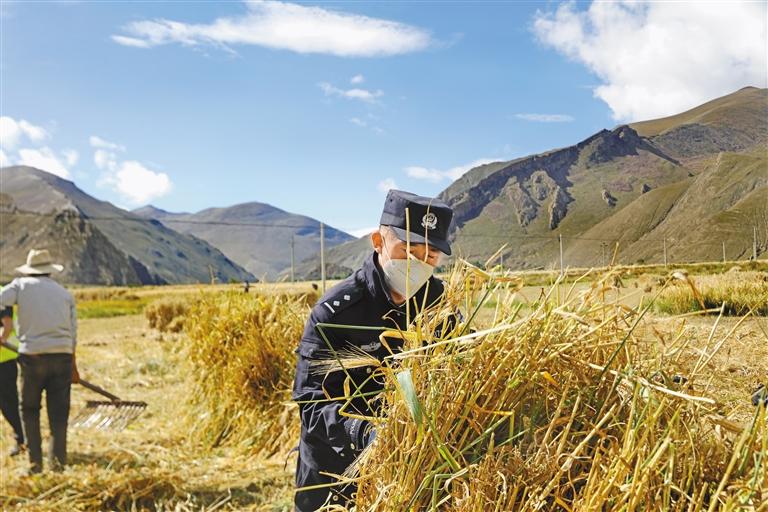 近日,日喀則市康馬縣公安局在統(tǒng)籌安排好工作的同時(shí),組織民輔警志愿者深入南尼鄉(xiāng)楚嘎村田間地頭,幫助缺勞力家庭開展秋收。在豐收的田野上,民輔警志愿者分工明確,有的用背負(fù)式收割機(jī)收割,留下一排排青稞茬;有的將成熟的青稞捆扎,堆積成一排排青稞垛子,進(jìn)行晾曬;有的忙于收集青稞穗,不浪費(fèi)一粒糧食。