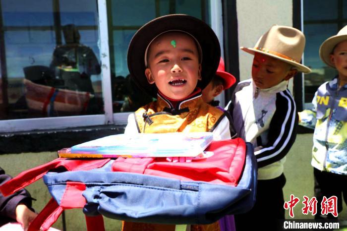 圖為普瑪江塘鄉(xiāng)小學(xué)生領(lǐng)取書包等學(xué)習(xí)用具?!±丝ㄗ涌h網(wǎng)信辦供圖