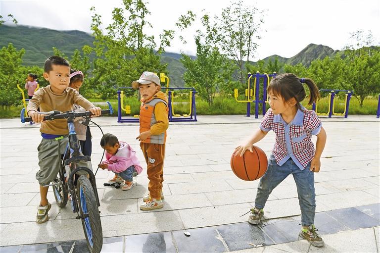 圖為山南市加查縣冷達(dá)鄉(xiāng)共康村的孩子們?cè)诟蓛粽麧嵉膹V場(chǎng)上玩耍。 記者 李洲 攝