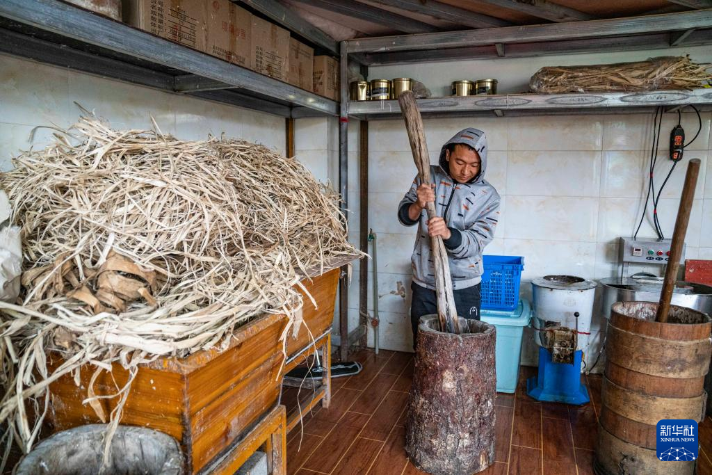 在西藏米林市羌納鄉(xiāng)西嘎門(mén)巴村,南迦巴瓦童螺嘎布工藝品農(nóng)民專(zhuān)業(yè)合作社的工作人員正在制作藏紙(7月26日攝)。新華社記者 孫非 攝